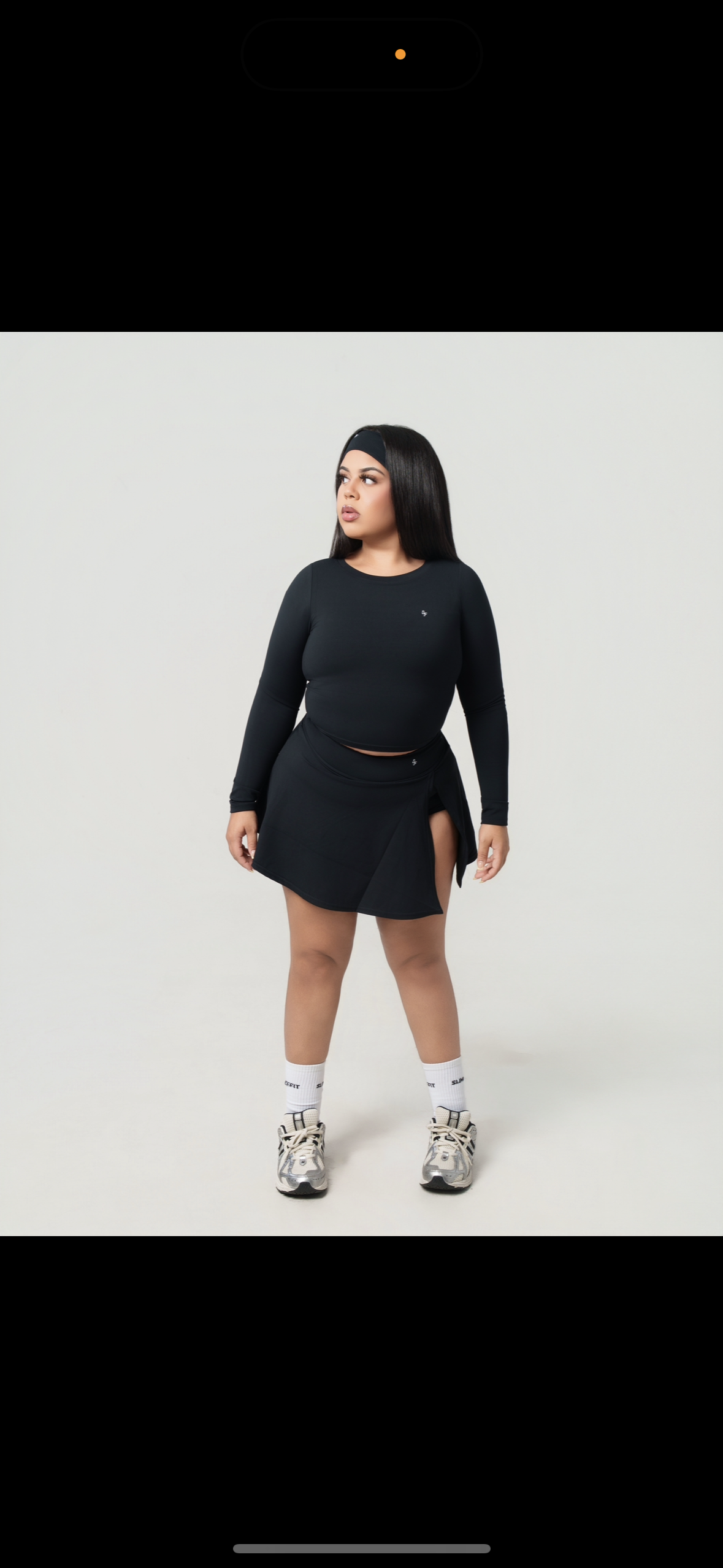 The three-piece "So Popular" Set is built on precise structure and clean lines. It features the essential Long-Sleeve Crop Top, the high-waisted Skort with a supportive inner short and high-fashion slit detail, and a matching Headband.